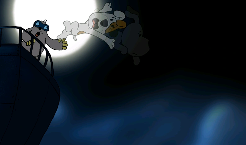 Reksio, Kretes i Kari-Mata korzystają z tego cudeńka i dostają się do swoich czasów... Niestety... Dzielny Pies i Komandor Kret są na otwartym... oceanie!