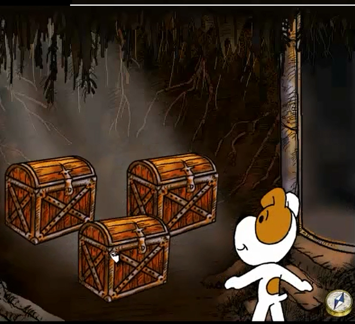 Reksio musi tak kliknąć w papugi stojące na drzewie by powiedziały zdanie "Do stu beczek zwietrzałego grogu, sezamie uparty otwórz się wreszcie!". Po tym będzie mógł wejść do tajemniczego pomieszczenia gdzie są trzy skarby będą one się obracały co rundę. W jednej skrzyni jest złoto, w drugiej Kretes, a w trzeciej Szkielet. Jak uda mu się trafić w odpowiednią skrzynie, wychodzi.